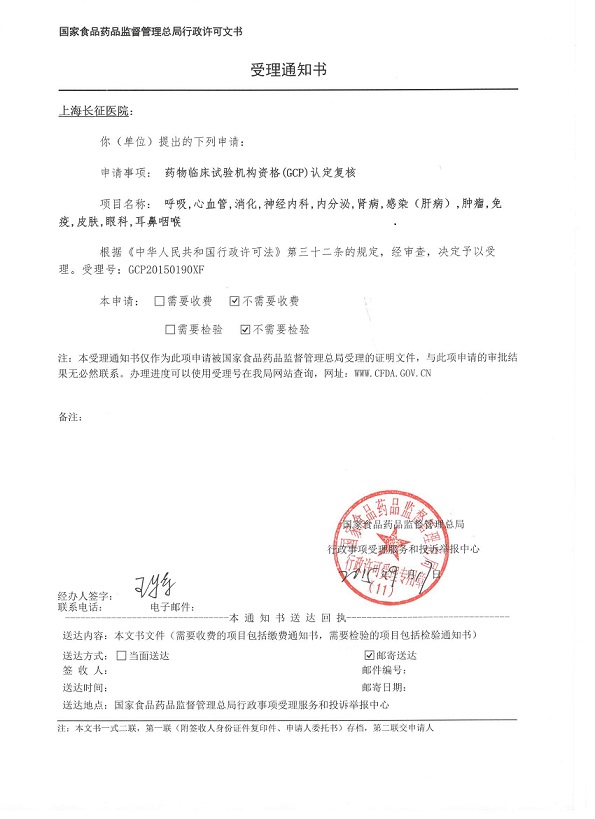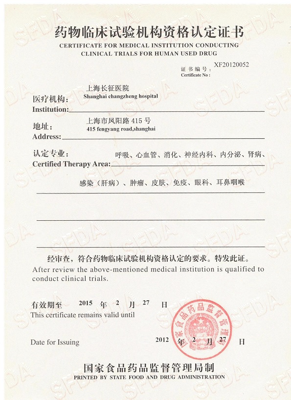 上海长征医院是一所集医疗、教学、科研为一体的综合性三级甲等医院。2005年1月通过国家药品监督管理局和卫生部的认证,被批准为国家药物临床试验机构,2009年顺利通过机构资格认定复核检查(证书编号XF20120052)。现有12个专业通过国家食品药品监督管理总局(CFDA)的机构资格认定,分别为呼吸、消化、内分泌、神经内科、免疫、眼科、耳鼻咽喉、心血管、皮肤、肿瘤、感染(肝病)、肾病。