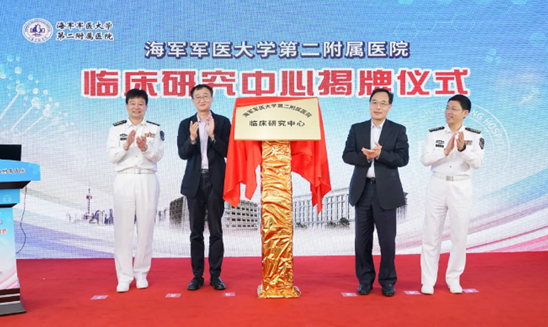 市卫健委邬惊雷主任(左二)、市科委朱启高副主任(右二)与张殿勇院长、宋耀星政委共同为“海军军医大学第二附属医院临床研究中心”揭牌